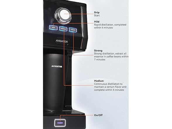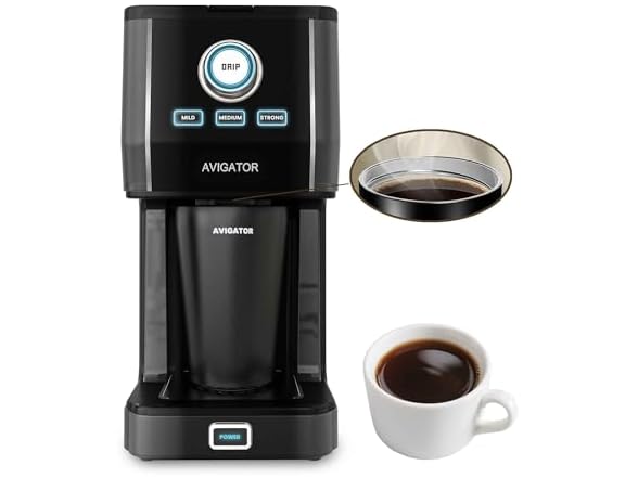 Avigator Single Serve Drip Coffee Maker Machines– Brew Perfection in Every Cup Avigator mini one cup drip coffee machine featuring brew strength control, you can simply customize your brew from strong to medium and mild, ensuring every sip matches your preference. Avigator single-serve coffee maker is ideal for small kitchens, dorm rooms, office spaces and counter space, delivering convenience without sacrificing quality. It comes with an 11oz. thermal travel mug that keeps your coffee hot, making it perfect for busy mornings or on-the-go adventures. For less waste of disposable paper filters or plastic, Avigator provide a reusable filter for this 2 cup coffee maker. Not only reduce paying to disposable accessories, also easy for cleaning. Additionally you could brew with your own mug that smaller than 11oz., place the height adjustable tray under the cup tray and place the mug on it. Simply add your favorite pre-ground coffee beans, choose the brew strength by pressing button, what to do next is to enjoy a fresh, barista-style cup.