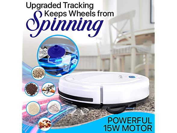 - DUAL ROTATING BRUSHES: The automatic vacuum cleaner robot pet hair robo vac has 2 rotating side sweeper brush to reach dirt/debris along walls or edges. No clogging from cat/dog pet hair. Works on hardwood, linoleum, tile, low/hard carpet floors