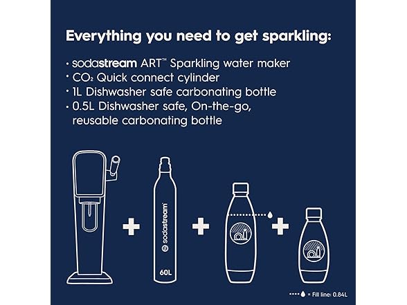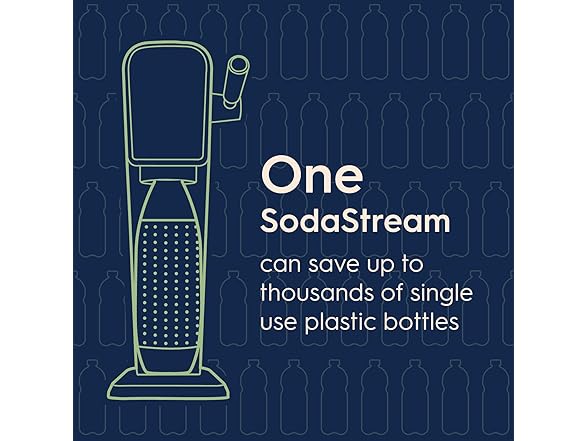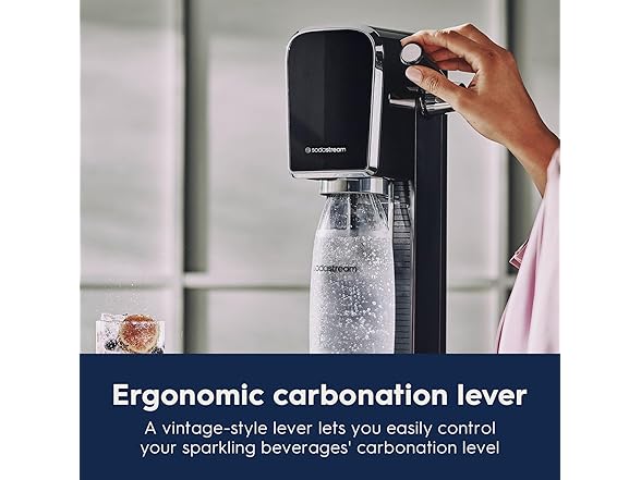 • Enjoy eco-friendly carbonation with the SodaStream ART; powered by reusable CO2 cylinders, each cylinder carbonates up to 16 gallons of water, the equivalent of 120 plastic bottles; reduce your carbon footprint while enjoying endless sparkling drinks at home