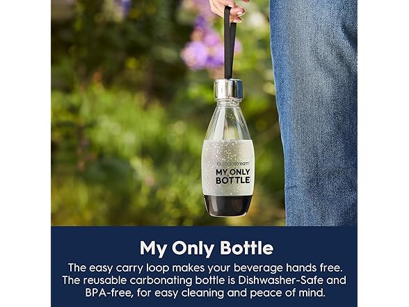 • Elevate your hydration game with the SodaStream ART Sparkling Water Maker Starter Pack; transform ordinary tap water into refreshing sparkling water with a simple pull of a lever; ideal for creating fizzy beverages for family gatherings or solo refreshment moments. This kit contains 1x 32 Fl Oz Slim Carbonating Bottle and 1x 16 Fl Oz On-The-Go My Only Bottle with a carrying strap, making it easy to take your bubbles with you for any occasion