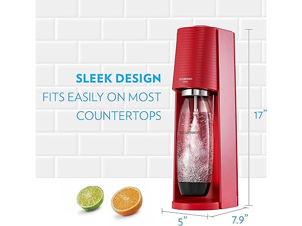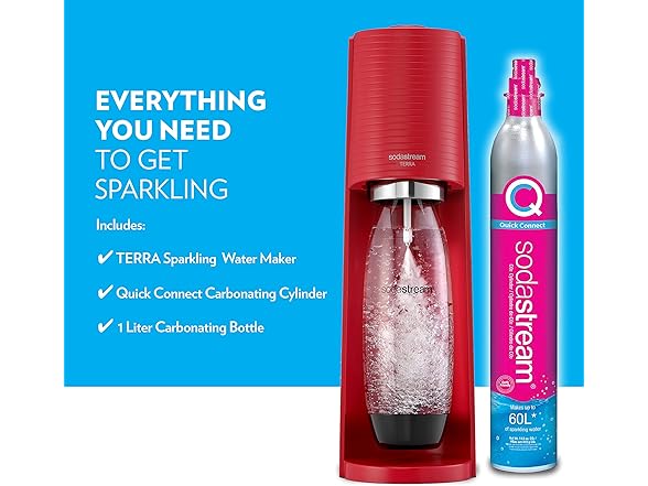 • Includes: sparkling water maker, quick connect 60L Co2 cylinder, and 1 liter dishwasher-safe BPA-free reusable carbonating bottles