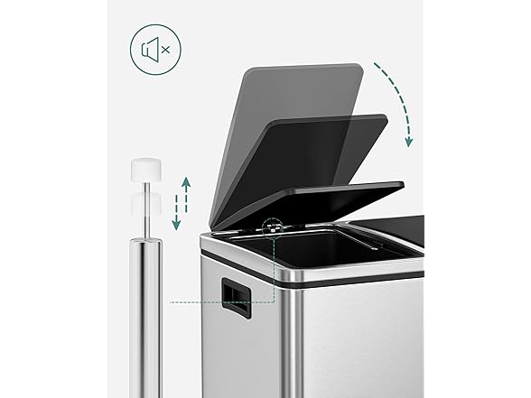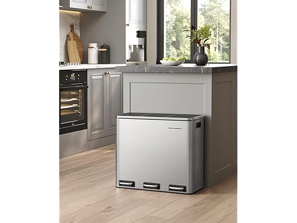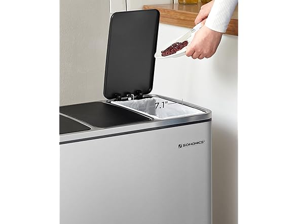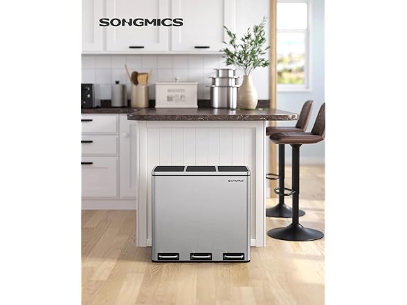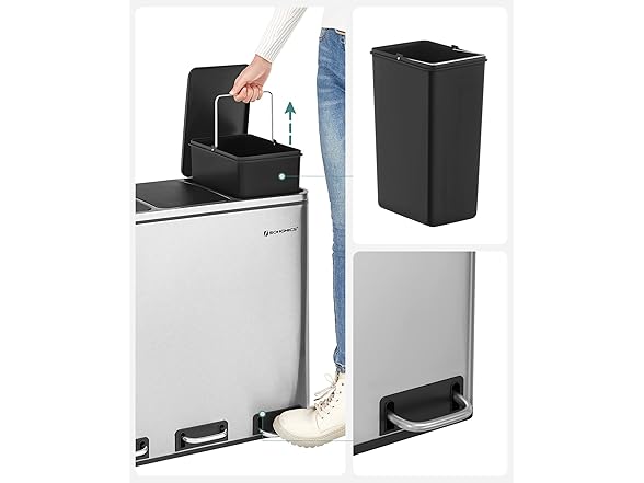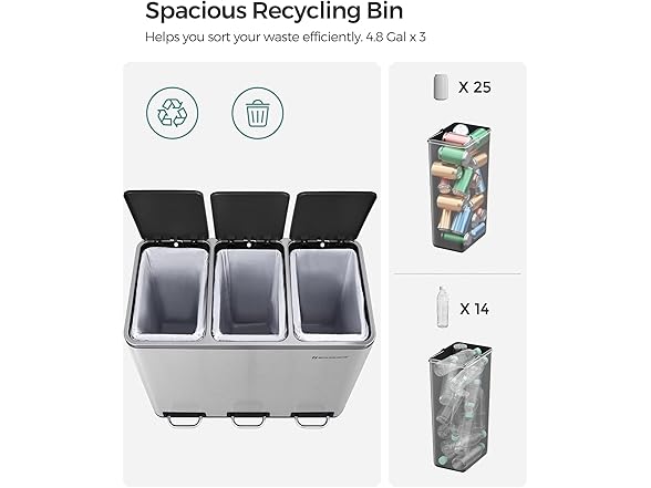 SONGMICS Trash Can, 3 x 4.8 Gallon Garbage Can, 14.4 Gallon Recycle Bin with Soft-Close Lids, Pedals, and Inner Buckets for Kitchen, Stainless Steel, Silver and Black ULTB54NL