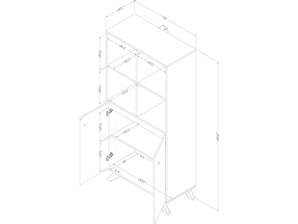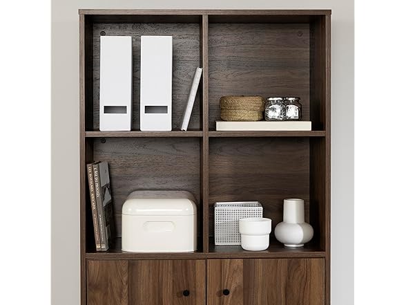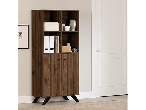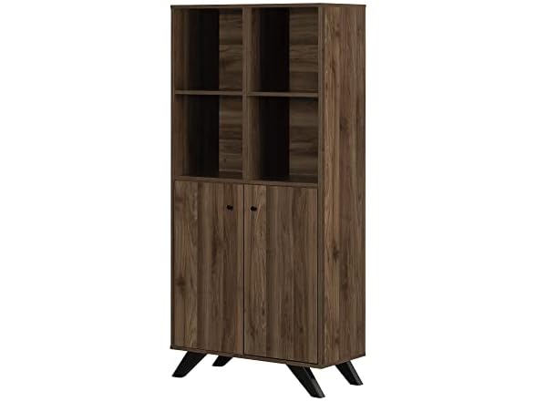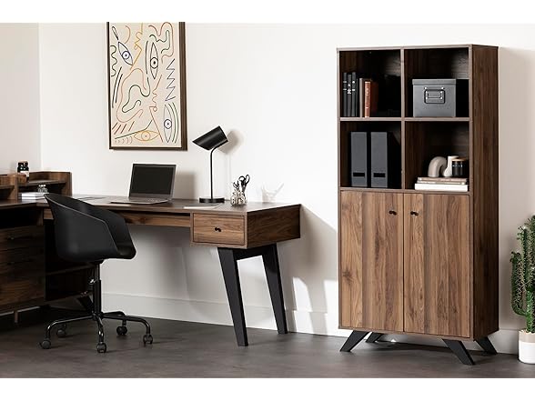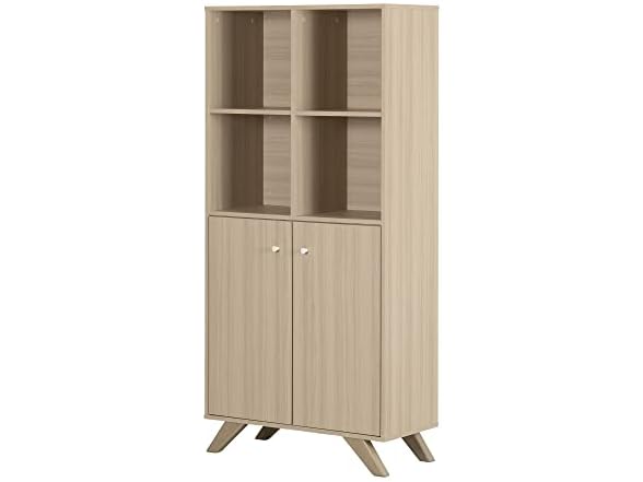 Wherever you put this bookcase – in your home office or a shared workspace – it’ll help you be more organized and efficient. The four open cubes can be used to store books, pens and pencils, binders, notebooks, and any other office supplies, while keeping them within easy reach. It also has two doors, behind which there's one removable shelf – a great space for keeping files, contracts, or paper and printer ink. This bookcase lets you have a totally uncluttered office, for a more ergonomic and better organized space. It’s definitely a “must have” for entrepreneurs and professionals! We love the Scandinavian style of this bookcase, with two features that set it apart: beautiful angled wooden legs and minimalist knobs on the doors. It’s sure to help you create a functional, relaxed, sleek-looking environment. This cabinet is a solid, durable piece. It was designed according to ANSI/BIFMA (American National Standards Institute/Business and Institutional Furniture Manufacturers Association) performance standards for small offices and home offices, for superior quality and sturdiness. This item is shipped in 1 box, make sure to have a friend with you. Assembly is required by 2 adults and tools are not included. This product is made in North America with Laminated particleboard and MDF. Accessories not included.