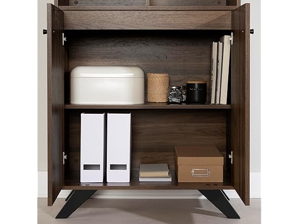 - TWO DOORS: This bookcase for your office was built with a superb pair of easy-to-open cabinet doors. They hide a removable shelf, which can support a maximum weight of 56 lbs. The storage space is ideal for office supplies, such as printer ink, binders, and file folders.