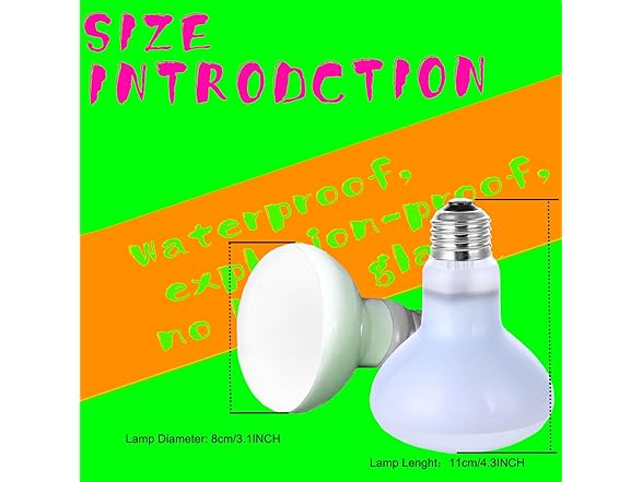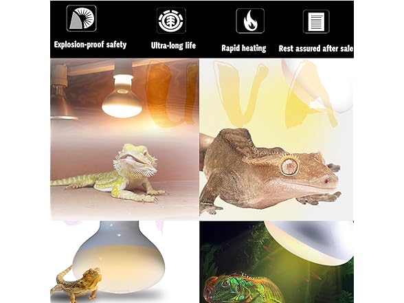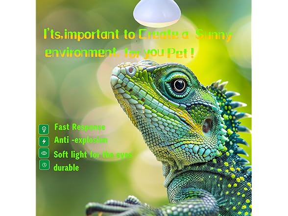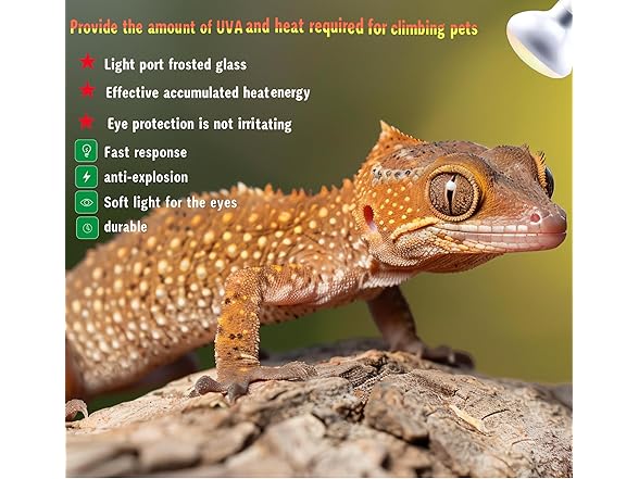 - 🦎.Note - You must use good quality ceramic lamp holders, and do not use it when the voltage is unstable. Do not use it with dimmers, thermostats, and rheostats. Do not splash water on the basking light bulb during use. Do not turn on the heat bulb immediately after turning it off, and do not turn the bulb on and off frequently. Create a refuge area for the reptile to move to in case of overheating.