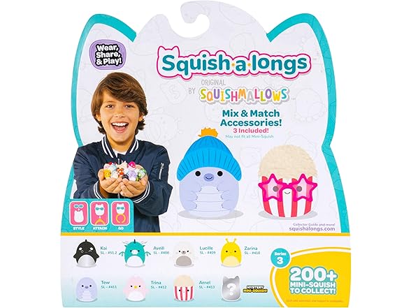 - COLLECTOR’S GUIDE Use the numbered Squish-a-longs Collector’s Guide to collect all Wave 3 styles; with 140+ Mini-Squish to collect, trade, or wear, the Squish might be small but the possibilities are endless!