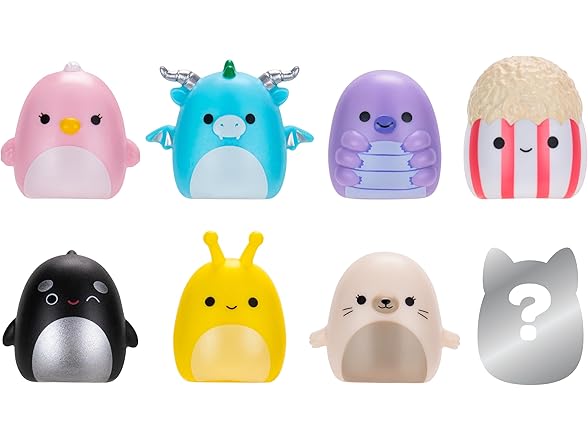 - MINI-SQUISH Includes Avril the Teal Dragon, Lucille the White Seal, Kai the Black Orca, Zarina the Banana Slug, Tew the Purple Water Boar, Trina the Pink Chick, Arnel the Popcorn Bucket, and a mystery Mini-Squish!