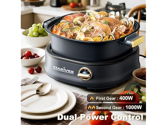 - 【Dual-Power Adjustment Electric Pot】The Stariver electric Pot offers a wide range of cooking options, so you can cook and sauté any of your favorite foods in this Hot Pot ! It has dual power settings. Adjustable power control up to 1000W allows you to use different power settings for cooking ramen noodles, fried rice, French fries, fondue cooking, stir-frying, sauteing vegetables, searing steaks, and more.