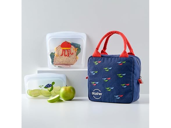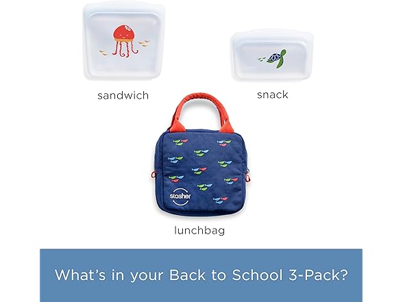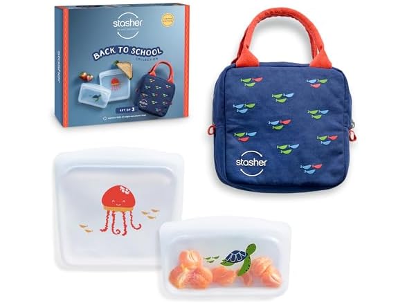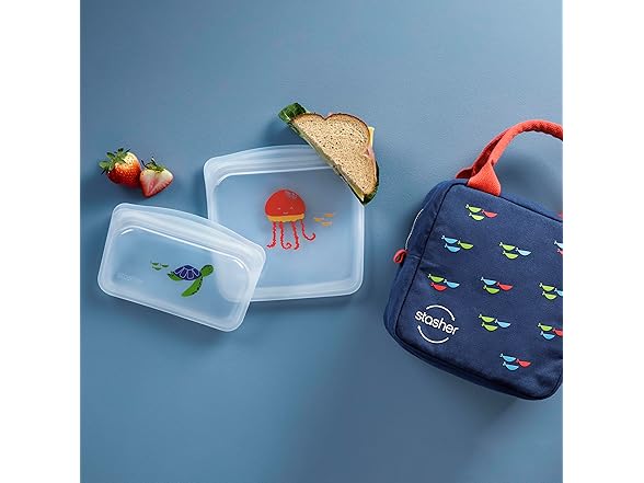 Welcome to Stasher- the simple, reusable alternative to single-use plastic bags. Now, meet our newest addition - the safely reheatable, endlessly reusable, perfectly versatile way to minimize plastic and food waste in your little one's lunch! Features two unique sizes with fun jellyfish and turtle designs to provide a wide range of uses and form an airtight seal to keep food fresh for longer, along with a limited-edition, premium heavy-duty, high-quality, insulated, and eco-friendly lunch bag. Made with platinum silicone material, these food bags offer durable material that’s microwave safe, dishwasher safe, oven safe (up to 425°F), and food safe. This limited edition set is the everyday companion you've been looking for. Includes a reusable box for convenient home storage and is an excellent way to start a waste-free journey!