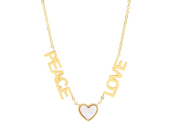 STEELTIME Ladies stainless steel or 18k gold plated stainless steel Peace, Love, and mother of pearl heart necklace