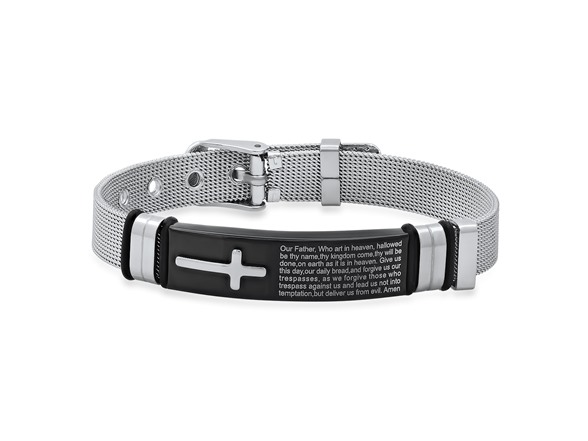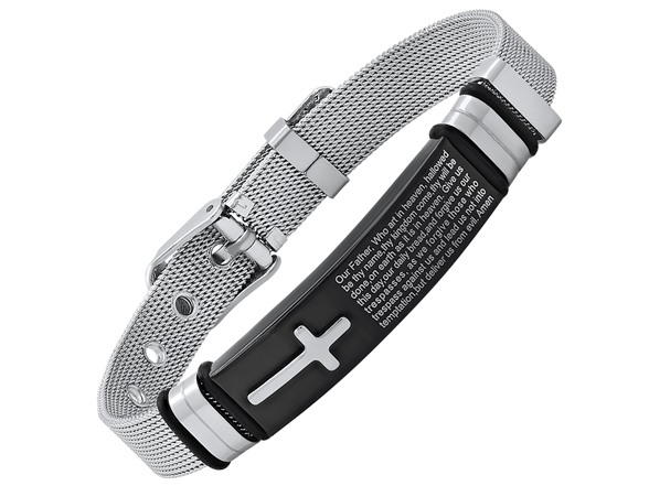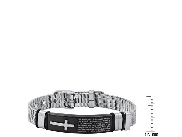 STEELTIME Men's two tone black ip and stainless steel Our Father prayer id mesh bracelet