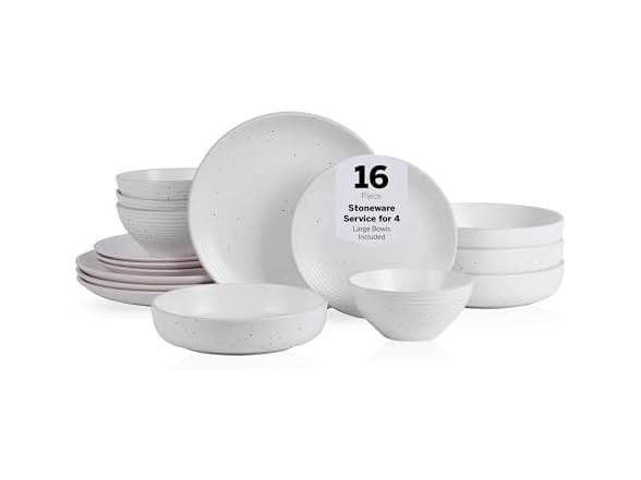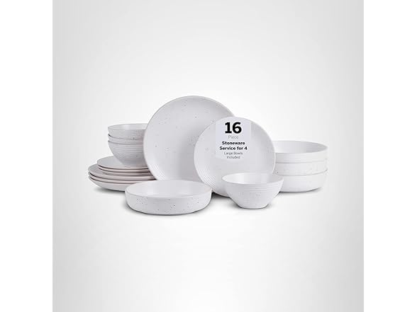 - This 16-piece stoneware dish set serves 4 with 4 dinner plates, 4 salad plates, 4 soup bowls, and 4 pasta bowls—ideal for smaller households or everyday dining.