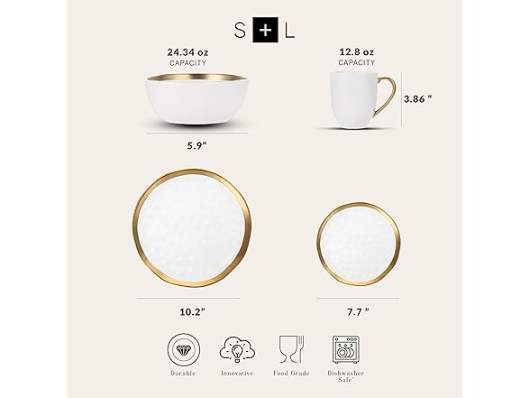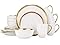 Glamorous yet timeless, the Florian porcelain dinnerware set from Stone Lain transforms your table with effortless elegance. This 16-piece collection includes 4 dinner plates, 4 salad plates, 4 bowls, and 4 mugs—crafted in smooth white porcelain with gold trim and pebbled texture for a luxurious, high-end look.