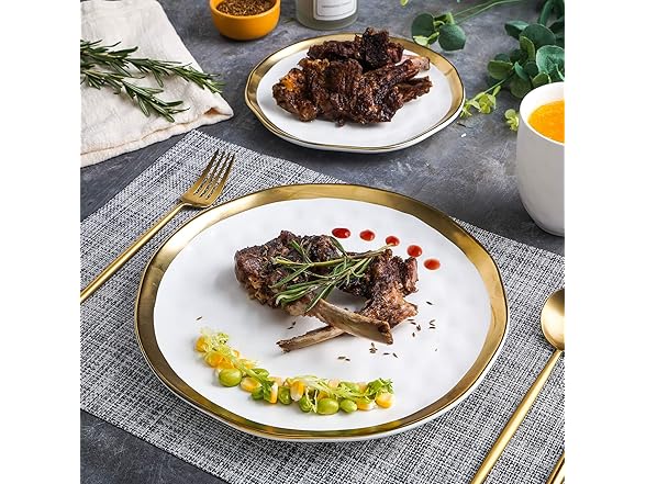 - Crafted in high-quality porcelain, this white dinnerware set is both refined and durable with organic shapes and luxe metallic detail.