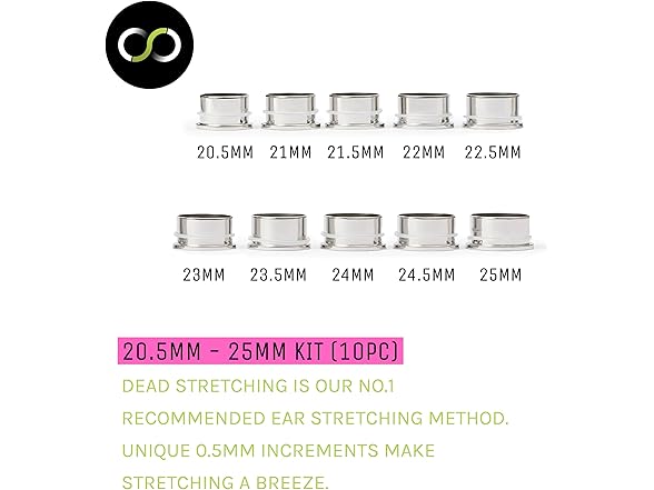 - THE PERFECT FIT FOR YOU: Our kits suit individual stretching goals and preferences for a stretching journey that’s as smooth as the jewelry you insert. This gauge kit includes 20.5mm, 21mm, 21.5mm, 22mm, 22.5mm, 23mm, 23.5mm, 24mm, 24.5mm, and 25mm. Larger kit sizes are available if you have bigger goals!