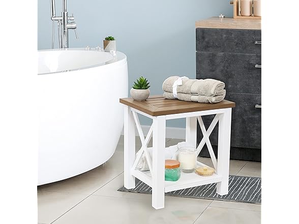 Sunnydaze 17” Freestanding Shower Caddy - Water-Resistant Shower Bench - Bathroom Bench with Storage Shelf and Leveling Feet
