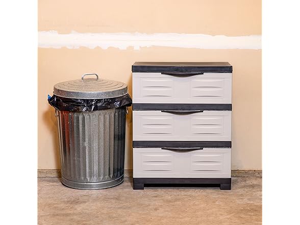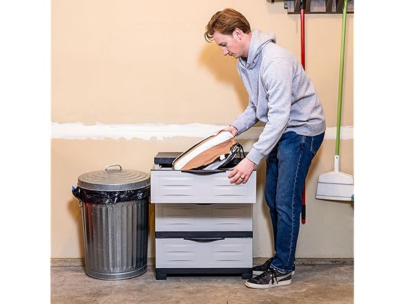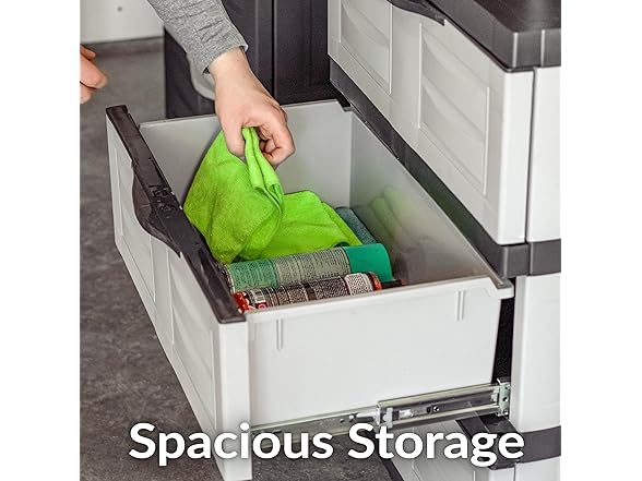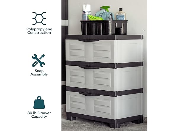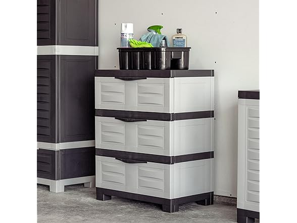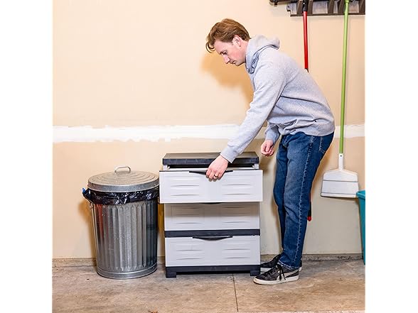 - VERSATILE STORAGE SOLUTION: Use the plastic storage cabinet with drawers to contain tools, extension cords, and more in the garage, add it to the laundry room storage for detergents and laundry supplies, or in an office to organize office supplies. It includes an anti-tip kit to securely anchor the cabinet to the wall for additional stability. The cabinet can be used as an alternative to metal shelving or bulky storage bins. It can be placed directly on tile, carpet, or wood floors-- no tools or platforms needed.