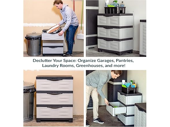 - PROVIDES CLUTTER CONTROL: The plastic garage storage drawer features 3 opaque drawers to keep the contents concealed for a clean look anywhere in the home. The storage cabinet is great for spring cleaning, garage overhauls, or back-to-school room organization. Do not allow children or pets to play on or inside the cabinet. Keep the drawers closed when not in use.