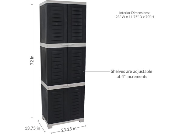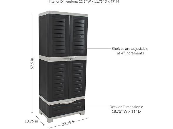 - With Drawer - 57.5" H: CONVENIENT STORAGE: This plastic garage storage cabinet offers plenty of storage space with 3 shelves and 1 drawer. The cabinet measures 23.25" W x 13.75" D x 57.5" H overall and weighs 31.4 lbs. Each shelf measures 21" W x 11.75" D x 1" thick and can be adjusted every 4". Each shelf holds 30 lbs, and the top of the cabinet holds 30 lbs. The bottom drawer measures 18.75" W x 11" D x 6.5" H inside and can hold 30 lbs. The drawer front measures 23.25" W x 1" D x 7.75" H.
