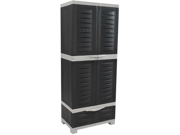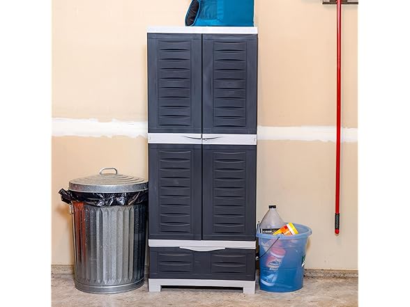 VERSATILE STORAGE SOLUTION: Adjust the 3 shelves in the plastic office storage cabinet to fit almost any storage need. The cabinet also features a bottom drawer, providing space for organizing cleaning supplies and more. Use the cabinet in the garage, mudroom, office, or closet. It includes an anti-tip kit to securely anchor the cabinet to the wall for additional stability.