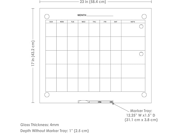 - REUSABLE AND EASY TO CLEAN: This elegant glass dry erase calendar for wall measures 23" W x 1" D x 17" H and weighs 7.8 lbs. The attachable aluminum pen tray measures 12.25" W x 1.5" D. It's a stylish addition to any office, kitchen, or bedroom.