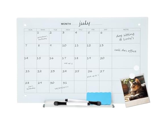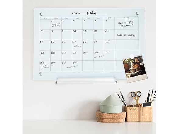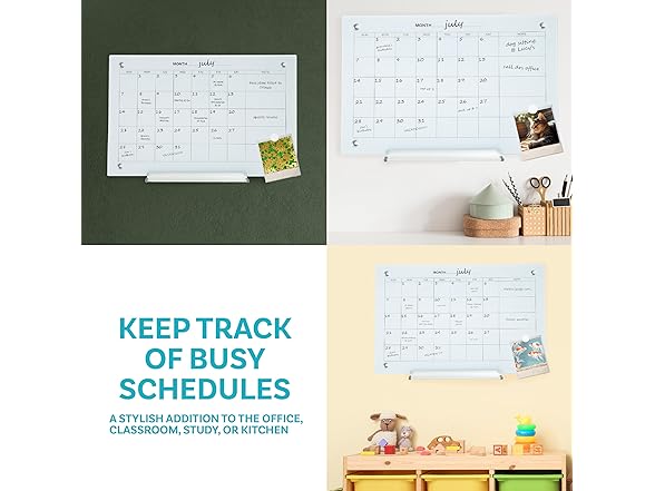 - KEEP TRACK OF BUSY SCHEDULES: This glass monthly calendar includes 2 strong magnets, an eraser, and 2 markers. Update this calendar with important appointments and then wipe it clean every month to start again.