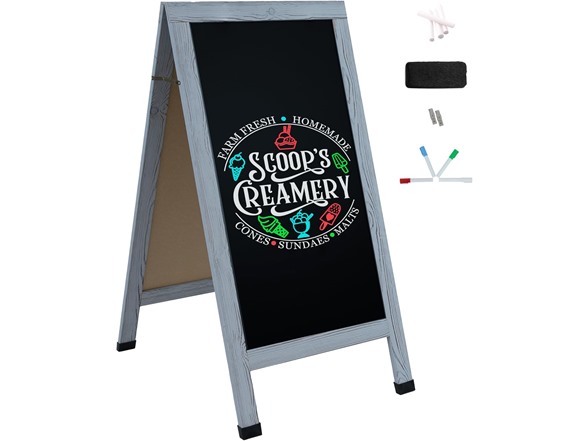 Share beautiful chalkboard messages with the world with this elegant double-sided standing chalkboard sign. Featuring two spacious 19.5" W x 36" H chalkboards, this display provides plenty of room for messages and drawings. The sandwich board style design allows for writing on both sides of the freestanding blackboard. The pine wood frame is available in two colors, rustic brown and graywash to complement any decor space. The backboard is made of iron and MDF board for lasting strength. The chalkboards are made of magnetic porcelain steel and it includes two magnetic clips to easily attach papers to the board. The hinges are made from iron with a copper color clear coat. Plus, this chalkboard sandwich board features PE foot caps for extra stability. Because it is constructed from durable materials, this A-frame chalkboard can be used both indoors and outdoors. Each board includes a set of 4 pieces of chalk and 4 liquid chalk markers to create beautiful messages and drawings. When finished, easily wipe away the messages using the included eraser. The markers are available in four colors, blue, red, green, and white. Also included with each board is a 10-piece stencil set that makes it easy to create lovely lettering for any event. This versatile sign is great for weddings, corporate events, grand openings, restaurants, and more!