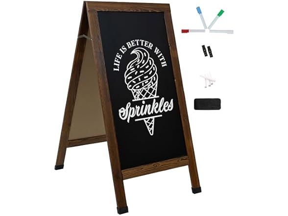 - CREATE BEAUTIFUL LETTERS AND DRAWINGS: This double-sided sandwich board sign includes a set of 4 pieces of traditional white chalk, an eraser, 4 liquid chalk markers, a 10-piece stencil set, and 2 magnetic clips. The chalk markers include four colors: red, blue, green, and white. They can be used with the included stencils to create colorful messages in elegant lettering. The magnetic clips can also be used to attach papers to the board.