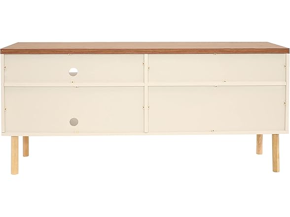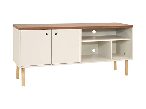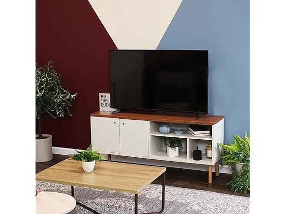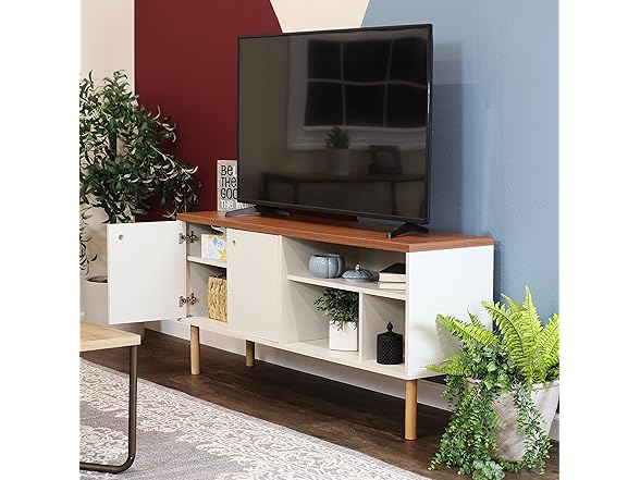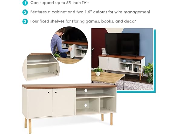 - STREAMLINED STYLE MEETS SMART STORAGE: Elevate any living space with a retro-inspired entertainment center that balances form and function. Designed for TVs up to 55", this mid-century modern stand features open shelving for consoles and decor, plus a spacious cabinet to conceal games, books, and media. Two built-in cable management holes keep wires tucked away for a clean, organized look.