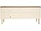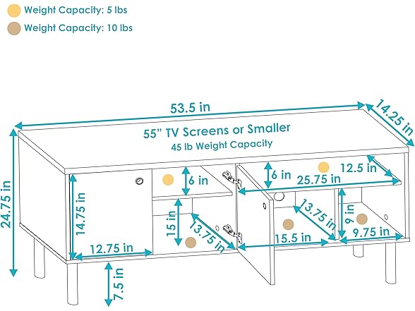 - FOR 55” TV OR SMALLER: The storage TV stand measures 53.5" W x 14.25" D x 24.75" H overall and weighs 58.6 lbs. The top shelf is 25.75" W x 12.5" D x 6" H and holds up to 5 lbs. The largest lower shelf is 15.5" W x 13.75" D x 9" H. The smallest lower shelf is 9.75" W x 13.75" D x 9" H. Each lower shelf holds 10 lbs. The bottom cabinet shelf measures 25.75" W x 13.75" D 15" H. The top cabinet shelf measures 25.75" W x 12.5" D x 6" H. The cabinet doors are 12.75" W x 14.75" H x 0.5" thick each.