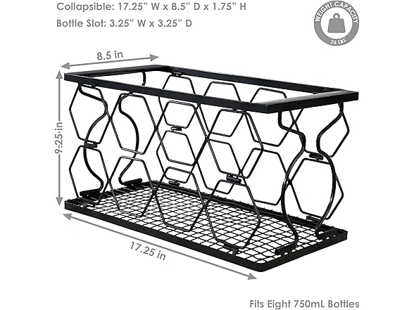 - SPACE-SAVING DESIGN: The wire wine rack collapses into a few pieces to make storing it when not in use convenient. Just press in on the sides and then push the top frame downward to flatten the rack. When folded, the rack is a compact 17.25" W x 8.5" D x 1.75" H to fit on a pantry shelf, in a kitchen drawer, or in a cabinet.