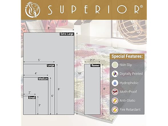 - QUALITY CONSTRUCTION: Superior’s screen-printed rugs are anti-static, moth-proof, & have a non-slip rubber backing