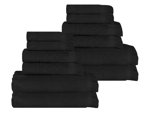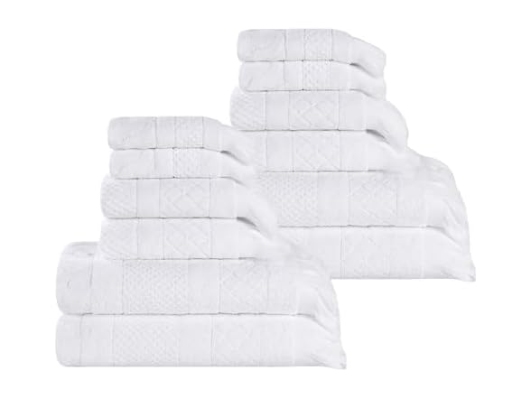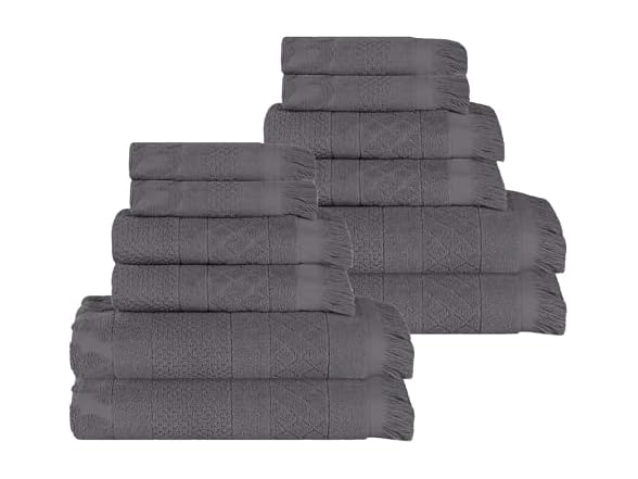Elevate your day-to-day routine with the unique touch of the Superior Rolla Cotton Geometric 12 Piece Towel Set. Expertly crafted from naturally strong and soft Cotton fibers, these impressive towels offer utmost comfort and longevity. Adorned with a jacquard geometric pattern, these unique towels will surely enhance your existing bathroom decor. These towels feel plush against your skin while offering a quick dry as you step out of the shower or bath. Finished with stylish frayed edges, these towels are perfect for any guest or master bathroom, spa, or resort treatment.