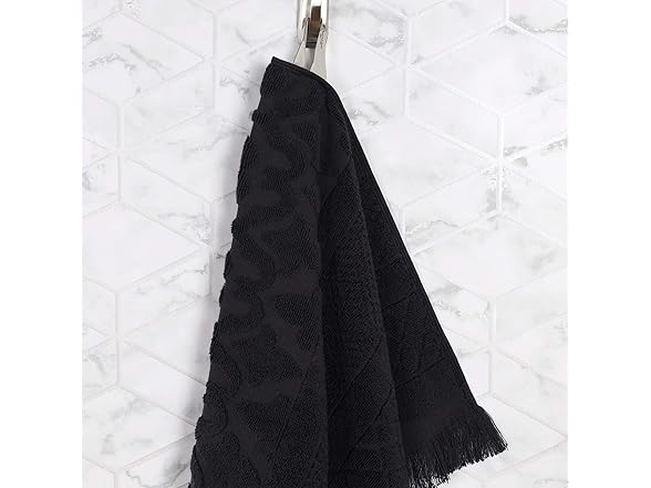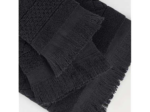 - SOPHISTICATED DESIGN: Each towel is finished with a geometric pattern and frayed edges for added style and elegance; excite any master bath, powder room, or guest bathroom with this beautiful bundle; hanging loop allows you to easily hang each towel