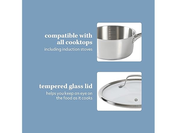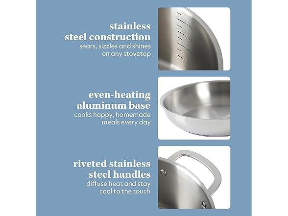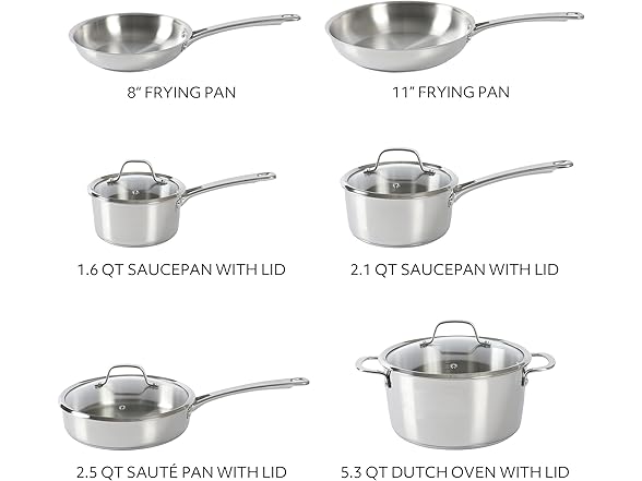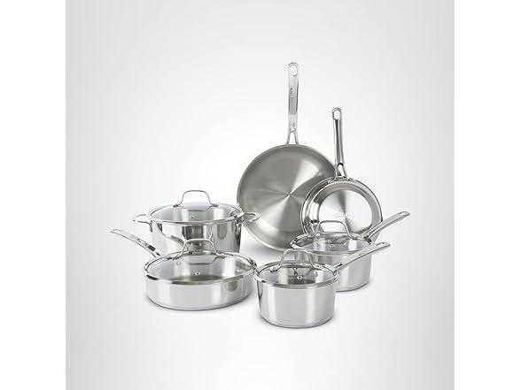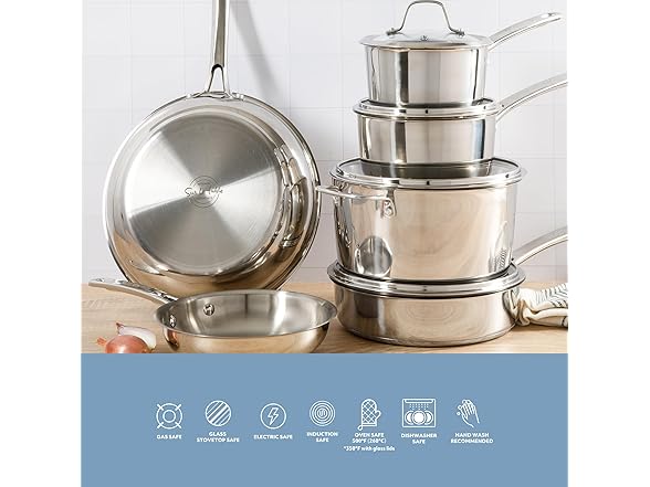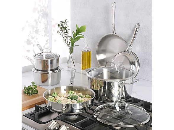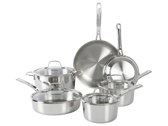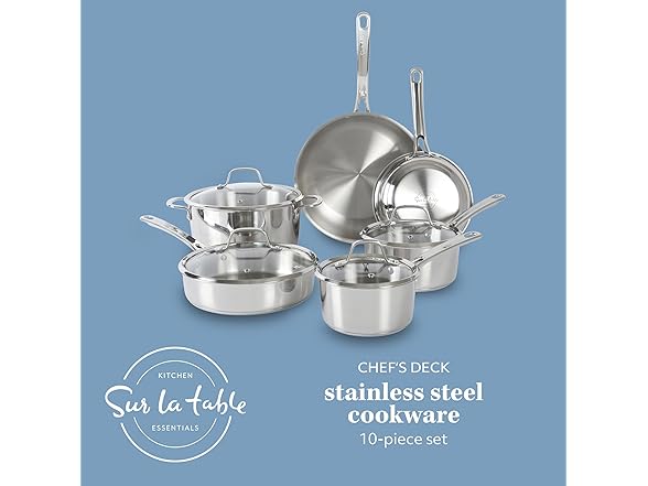 Sur La Table Kitchen Essentials Chef's Deck 10 Piece Stainless Steel Non Toxic Pots and Pans Kitchen Cookware Set w/Triply Encapsulated Base - Induction Safe