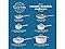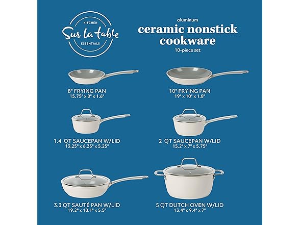 - WHAT'S IN THE BOX: two frying pans (8 inches and 10 inches), two saucepans with lids (1.4 quarts and 2 quarts), 3.3-quart sauté pan with lid, and 5-quart Dutch oven with lid