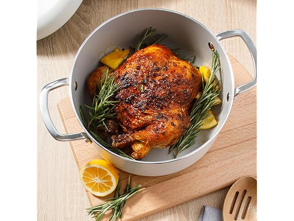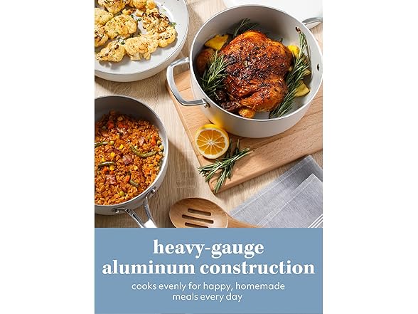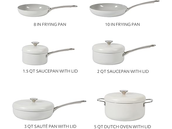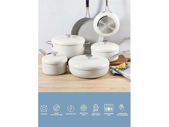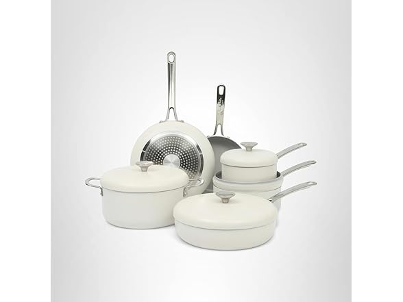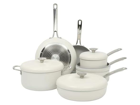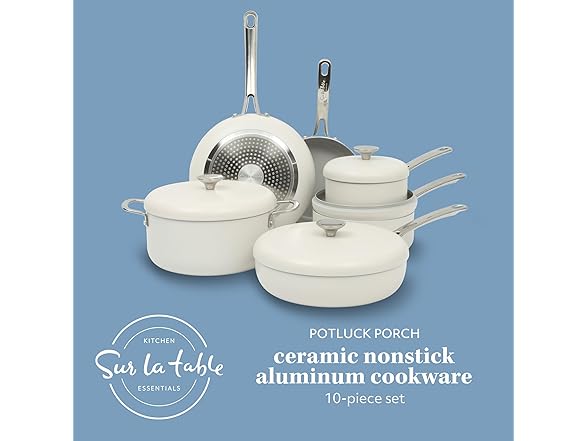 Sur La Table Kitchen Essentials Potluck Porch 10 Piece PFA Free Ceramic Non stick Interior Forged Aluminum Cookware Pots and Pans Set W/Aluminum Lids - Linen White - Induction Compatible