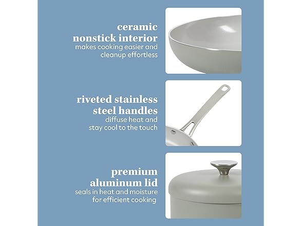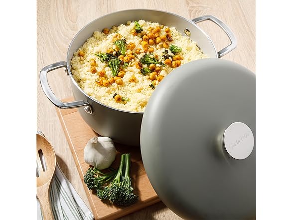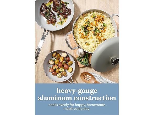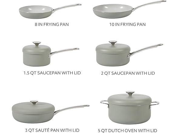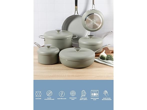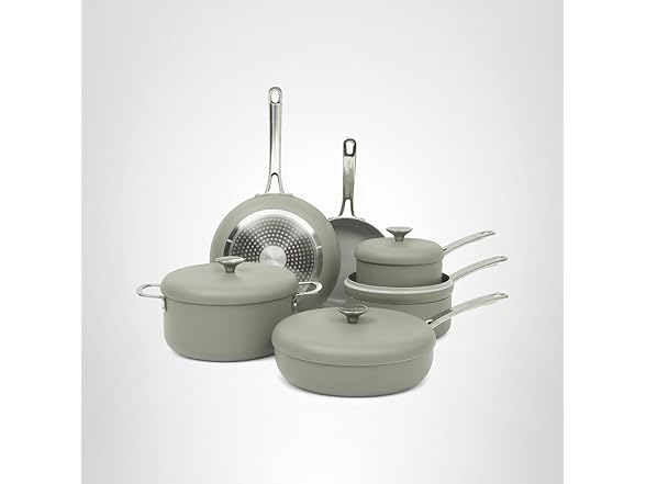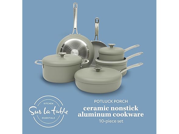 Sur La Table Kitchen Essentials Potluck Porch 10 Piece PFA Free Ceramic Non stick Interior Forged Aluminum Cookware Pots and Pans Set W/Aluminum Lids - Green - Induction Compatible