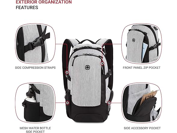 - UNPARALLELED ORGANIZATION: A front organizer panel embeds divider slip and mesh pockets for notebooks, ID, pens, pencil, and cords. This compartment opens into a lay-flat panel, making it easier for you to store and access essentials. Add a side zip pocket, an exterior water bottle pocket and compression straps to hold everything in place and you are ready to take on the day.