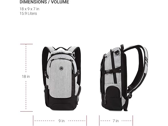 - DIMENSIONS: Exterior – 18” x 9” x 7”; Tablet pocket capacity – 10” x 7”; Bag volume – 15.9L