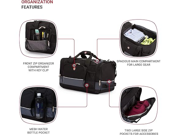 - Generous Storage: A large main compartment, 2 end pockets, and a front organizer for storing snacks, keys, and more make this the perfect travel or gym bag for men and women; A stretch mesh water bottle pocket keeps hydration close at hand