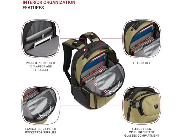 • 17-Inch Laptop Backpack: This durable daily carry features padded pockets for carrying a laptop up to 17” and an 11” tablet; A variety of integrated organizer pockets keep keys, pens, cables, eyewear, and other essentials within reach