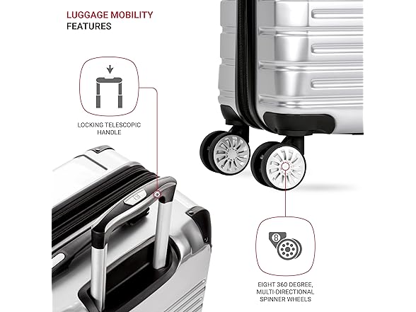 - MAXIMUM MANEUVERABILITY: Eight 360-degree multi-directional spinner wheels with a premium, push-button steel locking telescopic handle for maximum maneuverability