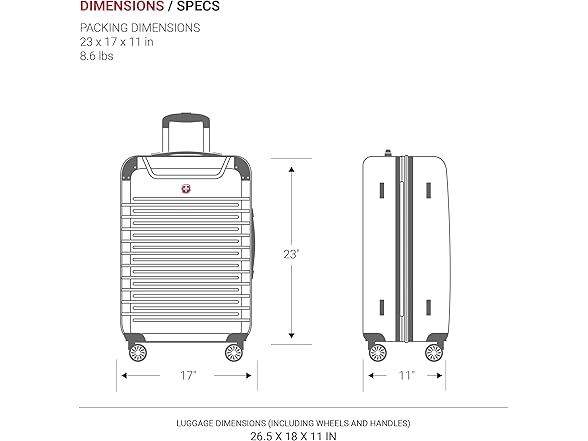 - THE PERFECT SIZE: 24 x 17 x 11 inches of packing space, with outside dimensions of 26.5 x 18 x 11 inches including wheels and handles