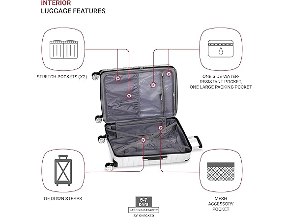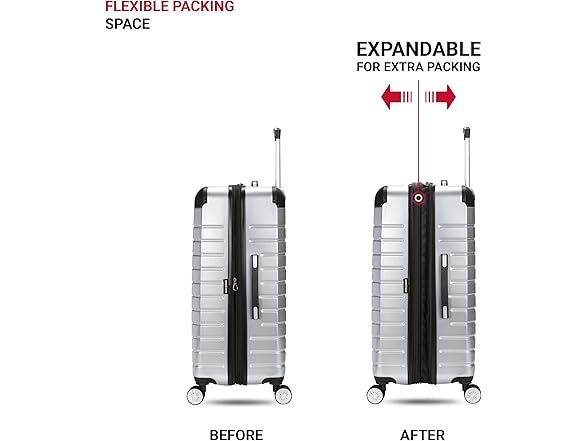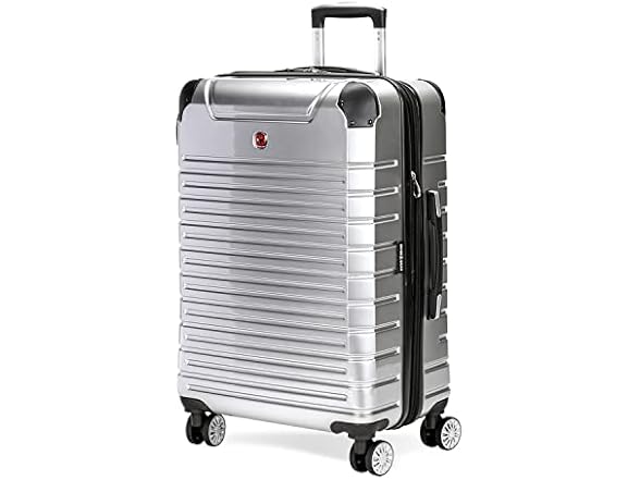 The SwissGear 7782 24-Inch Expandable Hardside Spinner luggage, with a plated exterior that is complemented by black corner panels, gives off an industrious flair. Its split-case design features 8 spinner wheels for optimum maneuverability. Inside lies elastic straps to cinch gear, double stretch pockets, a wet pocket, and a mesh zip pocket, and a large packing pocket for miscellaneous items. Pull along its push-button locking handle or grab its supple co-molded grab handles and let it lead the way