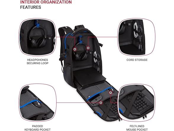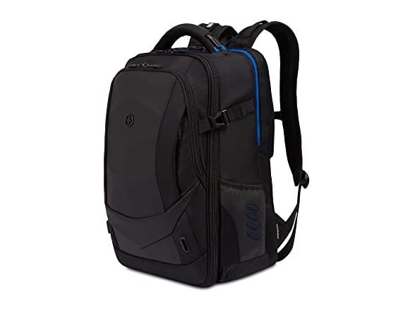 Get your game on with SWISSGEAR's 'The Gamer' USB Gaming Backpack designed for gamers who want it all. Designed in SWISSGEAR's specialty Smart-Design studio in close collaboration with pro gamers it's packed with features. Smart design means 360° protection for your 17-inch laptop and space for your Switch™, PS™ or Xbox™, keyboard, handheld console, controllers, headphones and accessories. Staying energized is easy with an external USB port and internal battery pack* pocket (*battery pack not included). For your personal items there’s a hidden pocket on the back and a side water bottle pocket. Comfort is of course paramount when you're on the go, the contoured shoulder straps, and high-density foam back with Air-Flow technology keeps you cool under fire. With legendary SWISSGEAR quality and a 5-year warranty, you’ll be ready to take on any opponent.