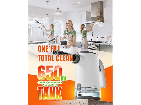 - CLEANS NONSTOP FOR 35 MINUTES: With a 21.98 oz tank (the largest in its category), this handheld steamer delivers up to 35 minutes of continuous steam, cutting down on the need for frequent refills—unlike older models that require constant refilling, wasting time