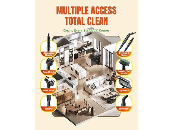 - 12PCS STEAM CLEANER SET: Equipped with 1*round brush, 1* grout brush, 1*accessory nozzle, 1* angle concentrator tool, 1*squeegee(can be separated), 1* extension hose, 1*clothes, 1*scouring pad brush, 1*flat scraping tool, 1* funnel, 1*measuring cup