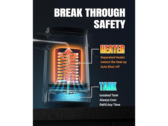 - UPGRADED SAFETY WITH ISOLATED TANK: All electrical and heating parts are fully isolated from the water, preventing issues like backflow, sudden brusts , and the need to wait before refilling. The transparent tank lets you check water levels at a glance, and you can refill anytime without interruption