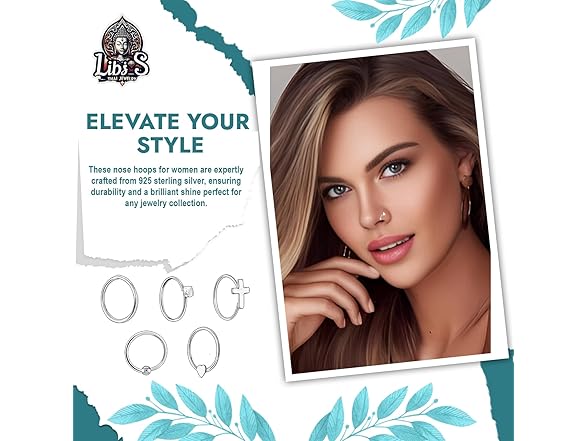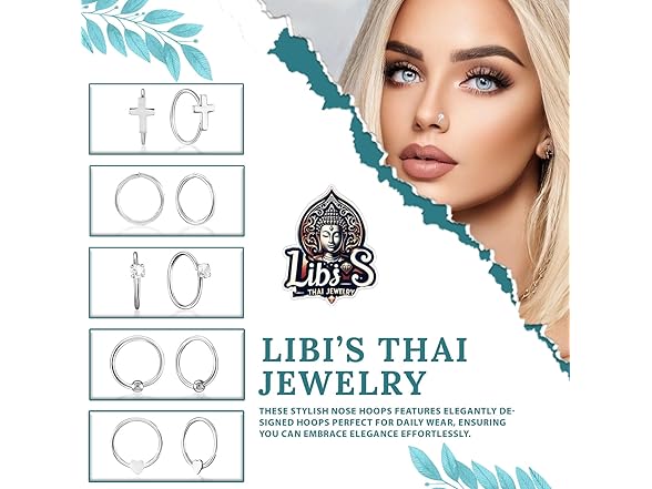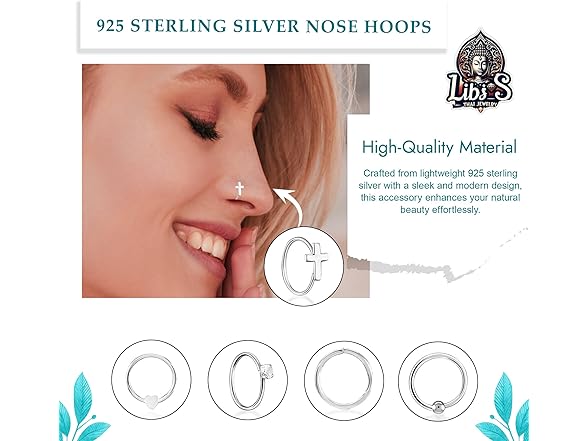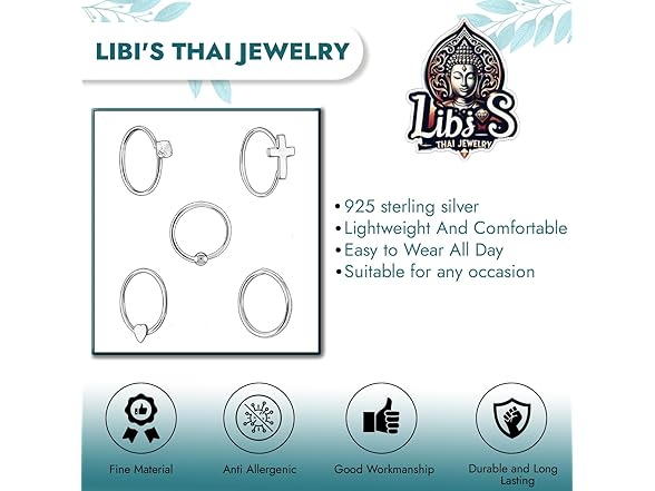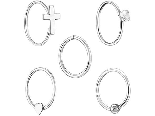 Thai Jewelry 925 Sterling Silver Nose Hoops - Nickel, Lead-Free Piercing Rings - Stylish, Cute Jewelry for Women - Classic Nose Hoops with Sparkling Crystals - Pack of 5